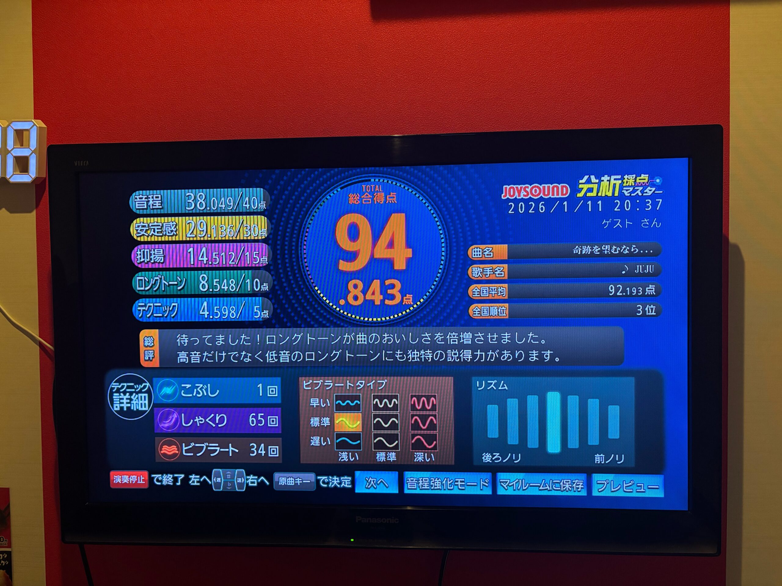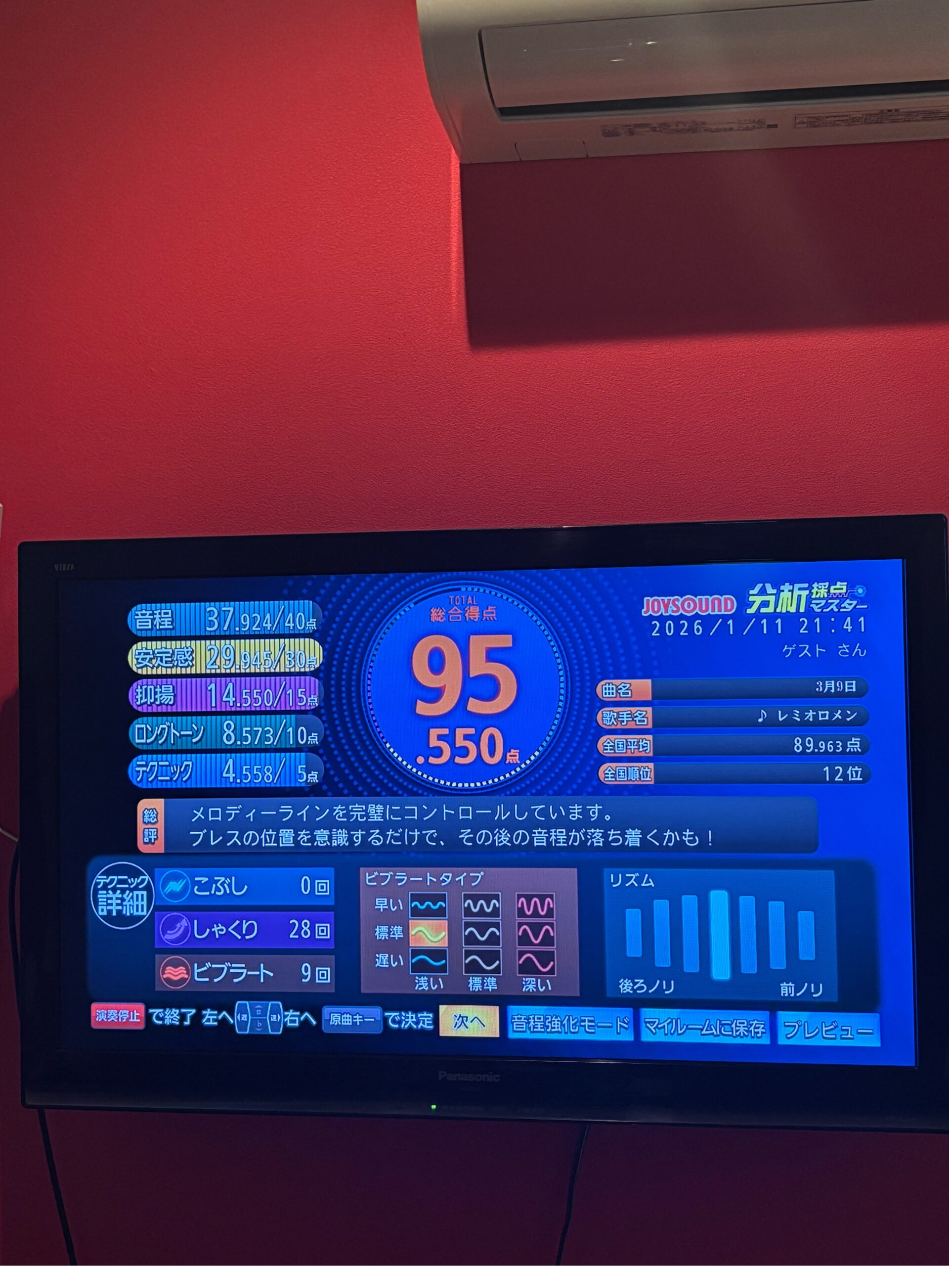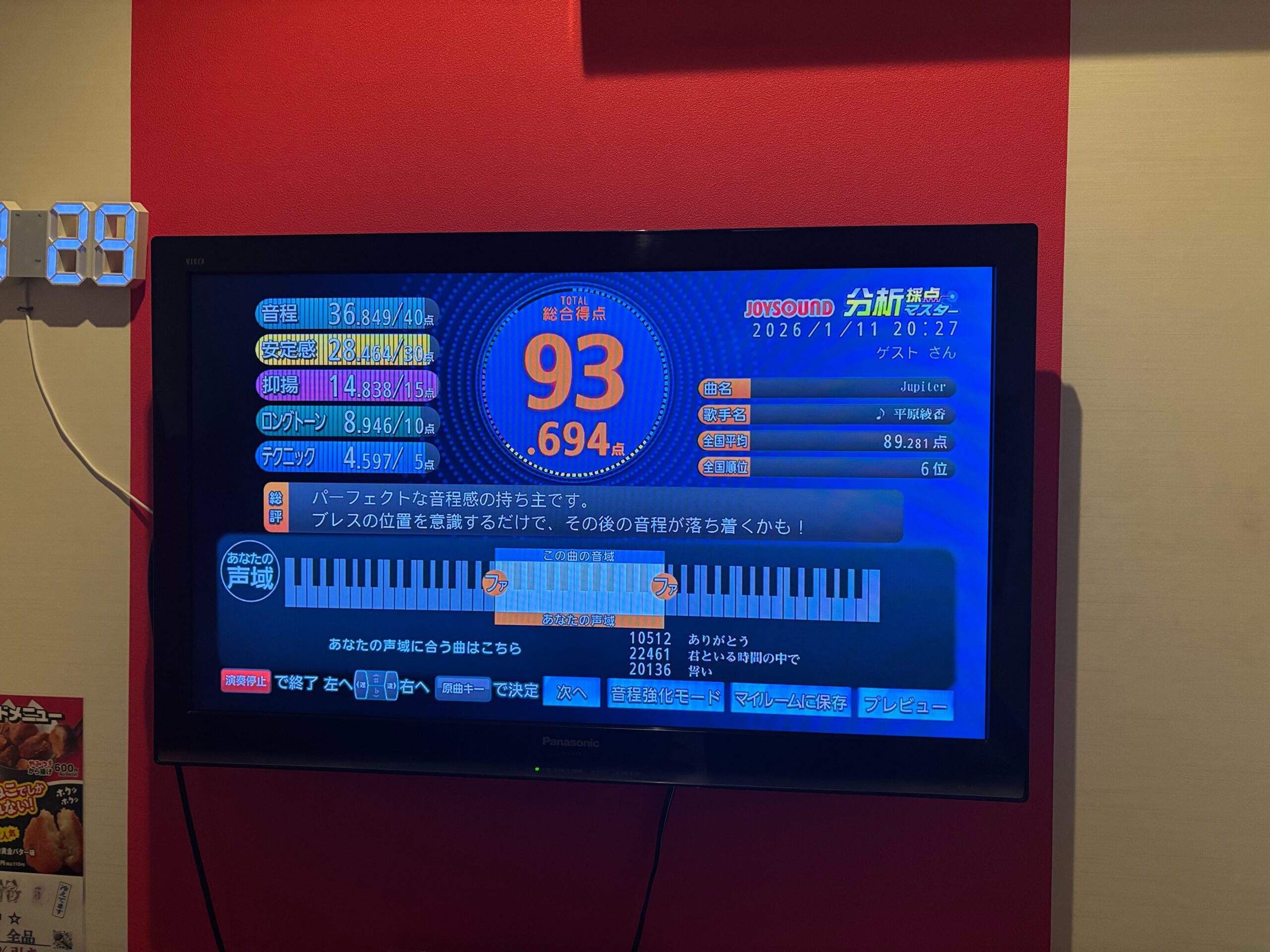 カラオケは採点も入れて歌ってみましたが、なかなかの高得点をとれたので写真におさめました(笑)