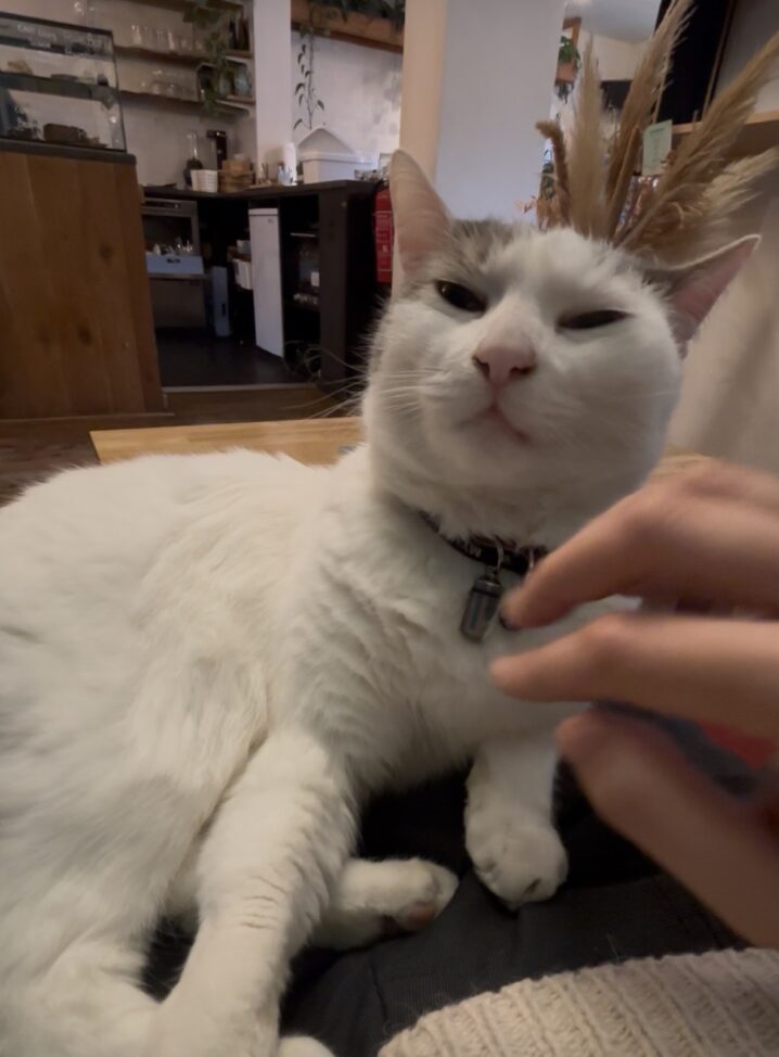 サロンの近くのお気に入りのカフェに来ました。 ここの猫ちゃんとはまだ戯れあったことがなかったのですが、今日は空いているスペースに猫が寝ていて、隣に座るチャンス!! 可愛い♡ チャイラテを飲んでいたら、なんと! 猫ちゃんが…